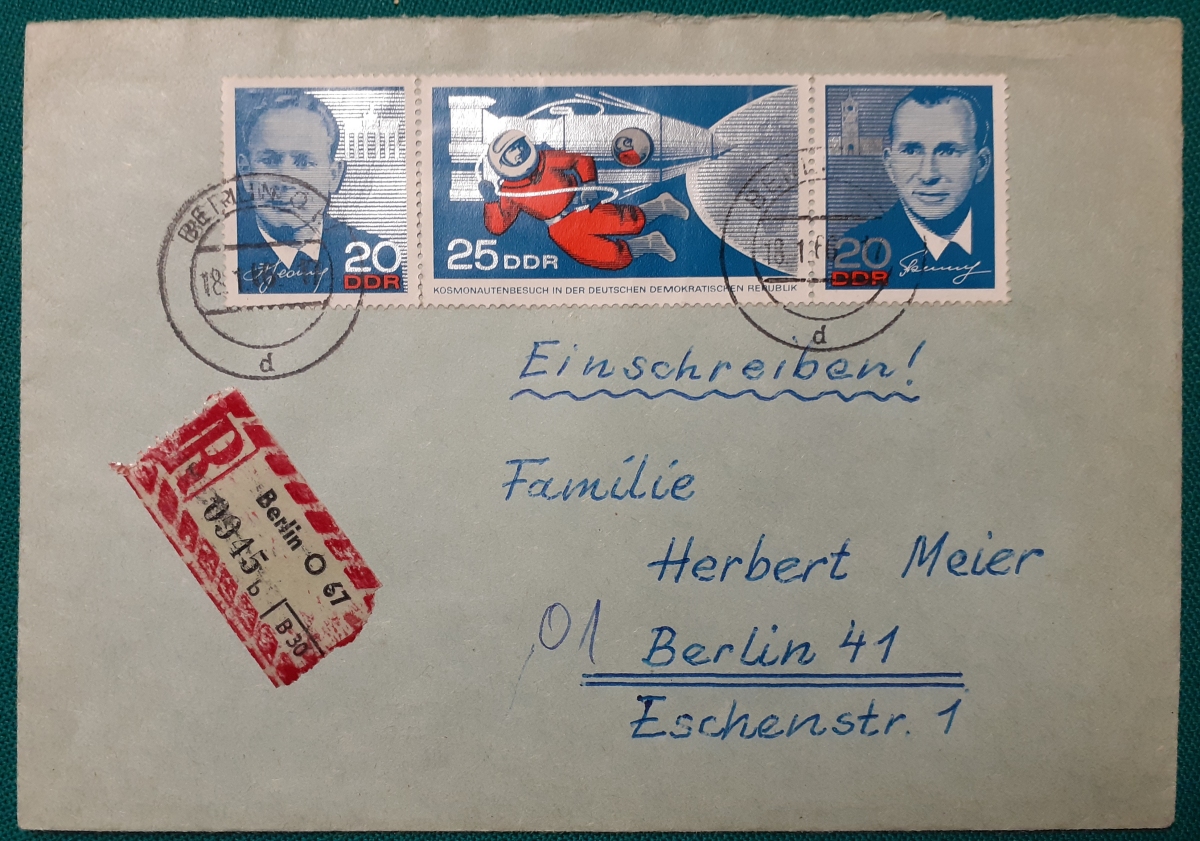 Umschlag mit dem o.g. Dreierstreifen 20 +25+20 Pf.; gelaufen am 18.1.1966 innerhalb Berlins als Einschreiben (Erstausgabe des Dreierstreifens war der 1.10.1965); guter altersgemäßer Zustand Preis: 3 EURO |