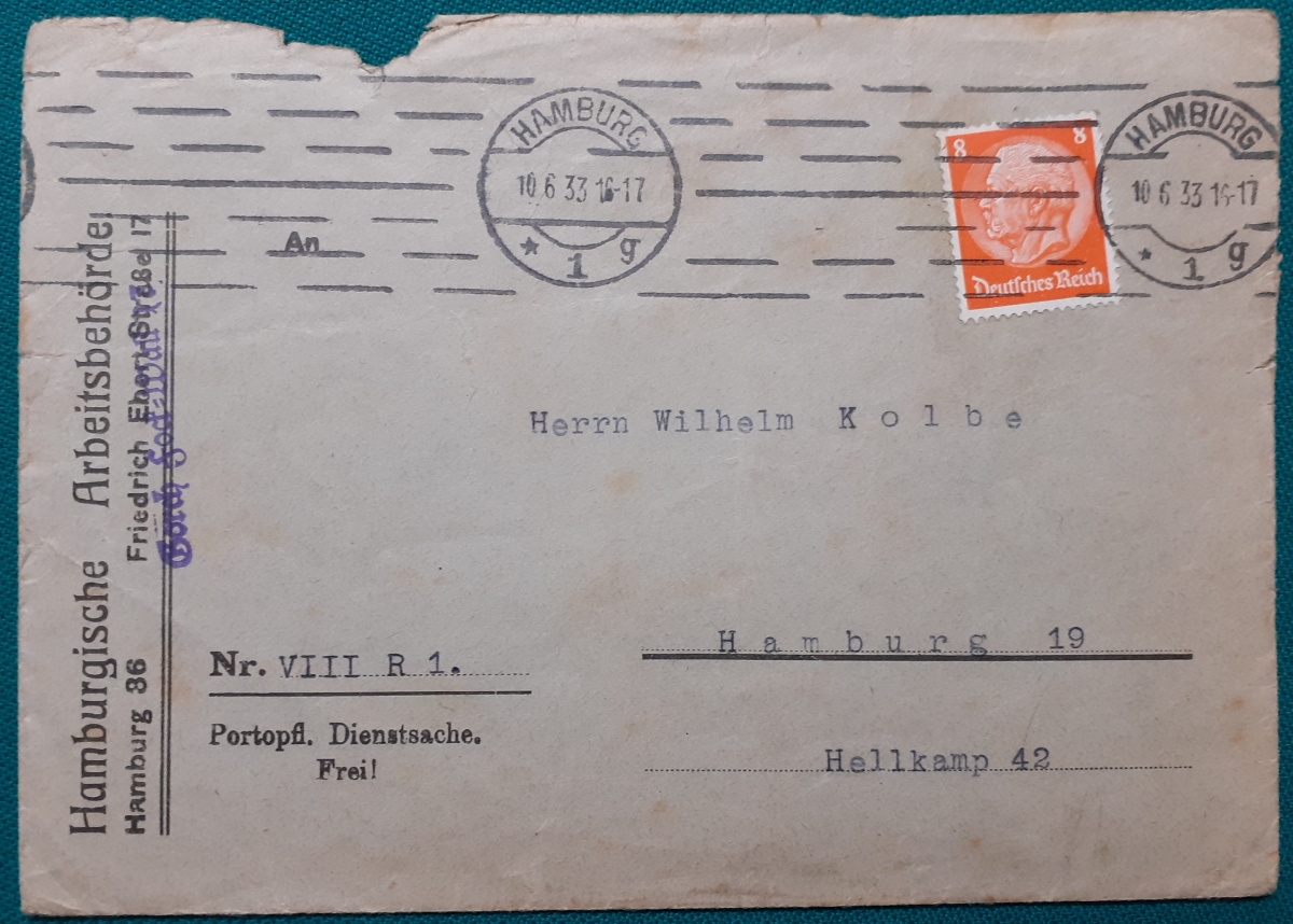 "Briefumschlag von 1933" Briefmarke Deutsches Reich Hindenburg 8 Pf. rot; gelaufen am 10.6.1933 von der Hamburgischen Arbeitsbehörde innerhalb Hamburgs; Rundstempel; Umschlag in recht gutem altersgemäßen Zustand Preis: 2 EURO |