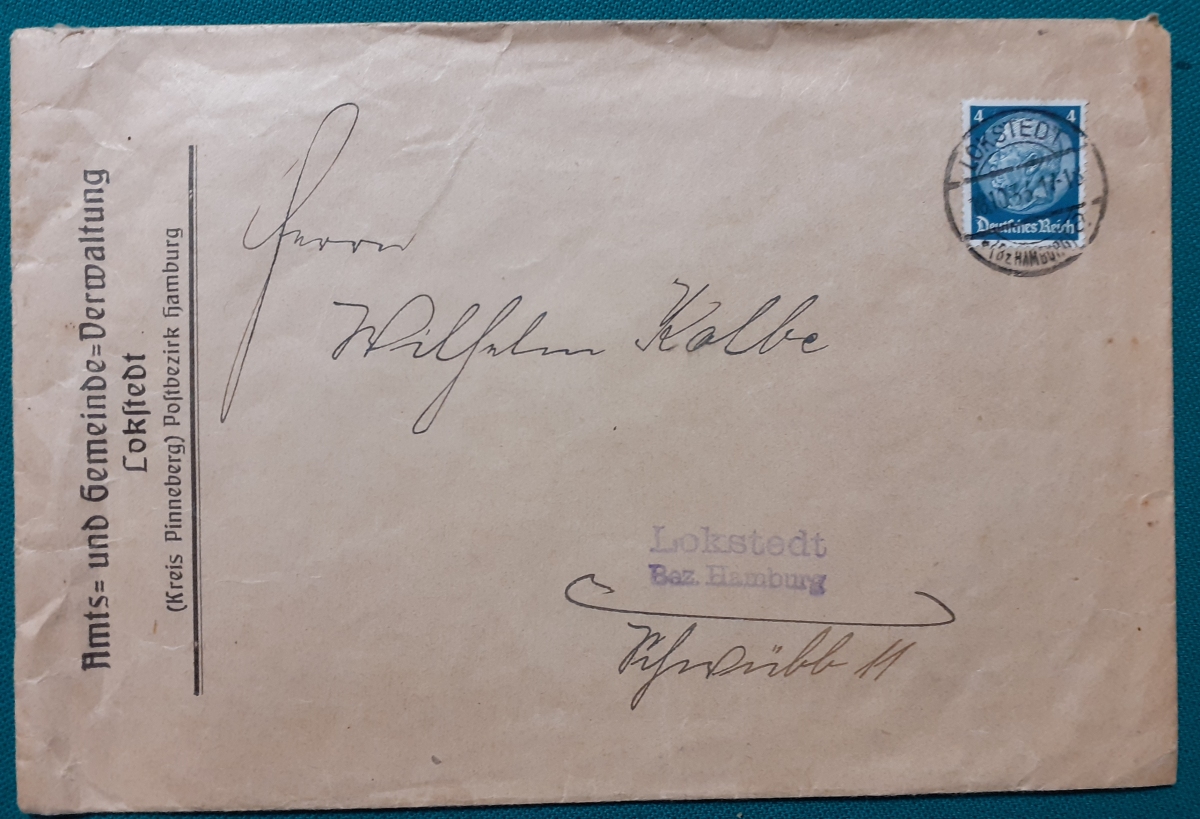 "Briefumschlag von 1933" Briefmarke Deutsches Reich Hindenburg 4 Pf. dklgrün; gelaufen am 18.10.1933 von der Amts- und Gemeindeverwaltung Lokstedt (Kreis Pinneberg) nach Hamburg; Rundstempel; Umschlag in recht gutem altersgemäßen Zustand Preis: 2 EURO |