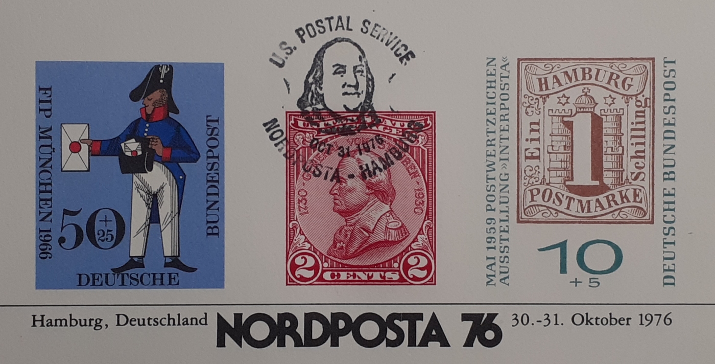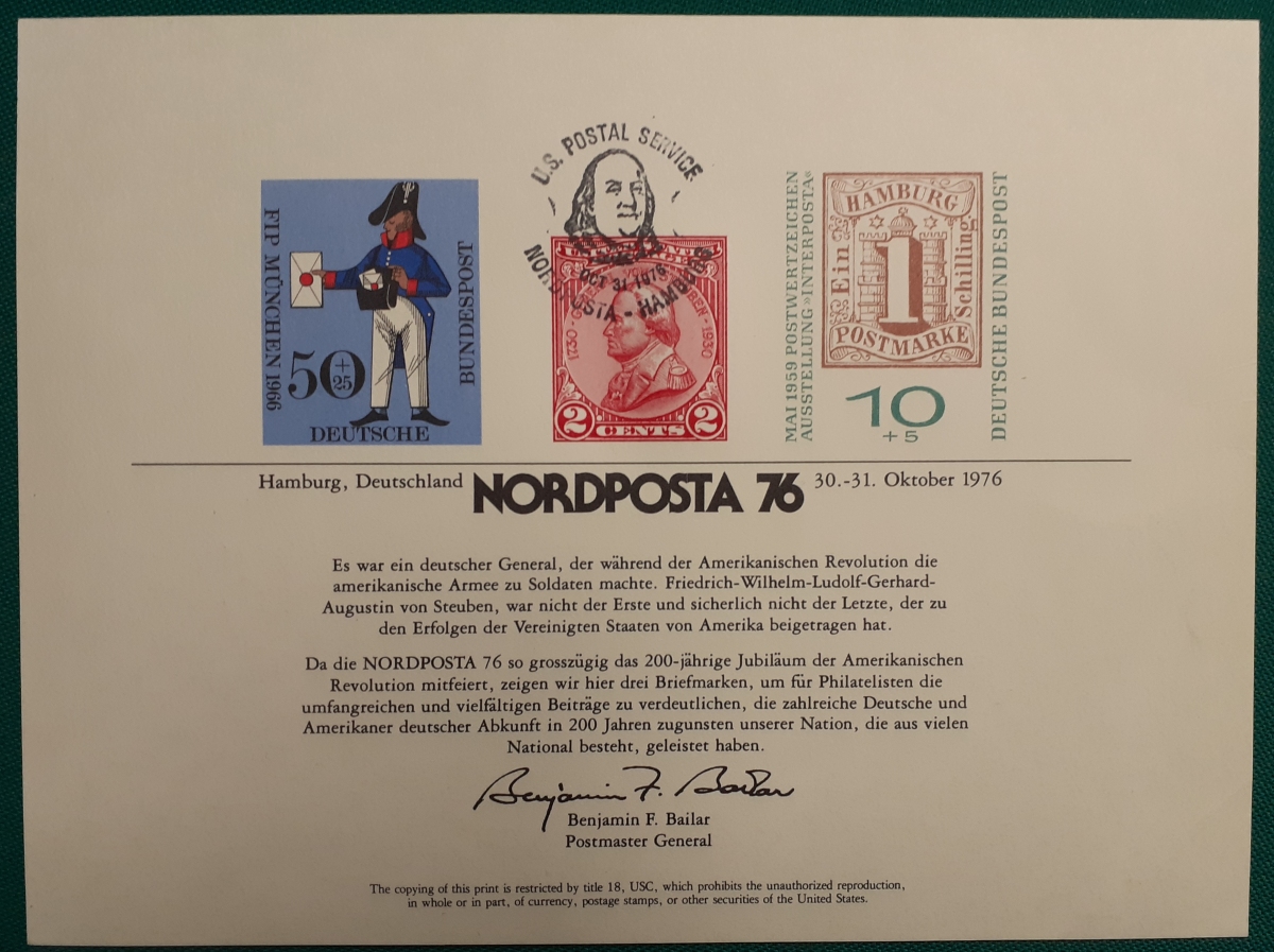 Karte im Format 20 x 15 cm mit einem offiziellen US-Sonderstempel der US-Postverwaltung zur Nordposta 76 in Hamburg; mit einer Widmung des Postministeriums der USA; Karte in gutem altersgemäßen Zustand Preis: 3 EURO |