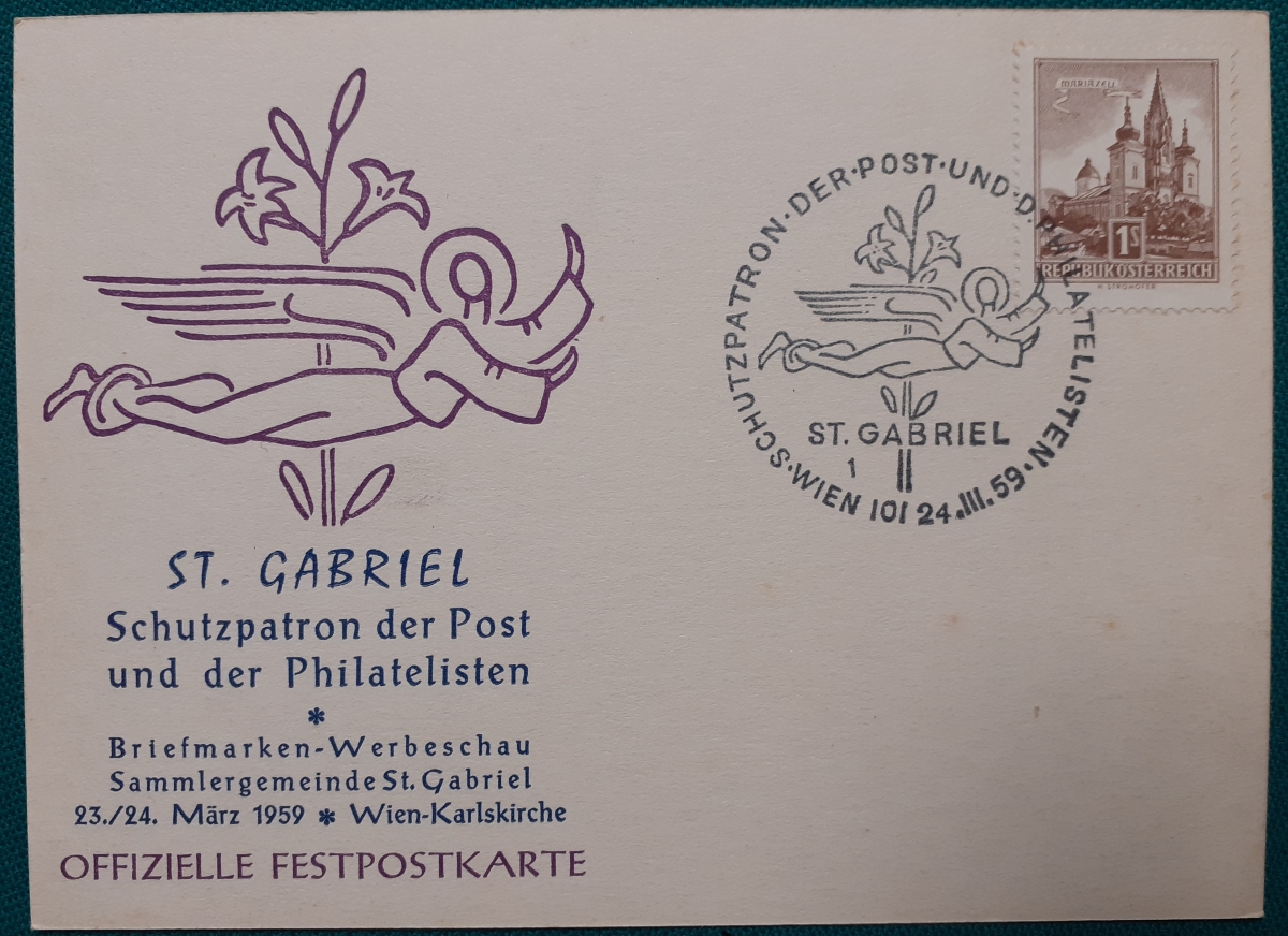 St. Gabriel - Schutzpatron der Post und der Philatelisten Karte mit aufgeklebter Marke "Mariazell, 1 Sch."; schöner Sonderstempel in sehr gutem altersgemäßen Zustand Preis: 1 EURO |