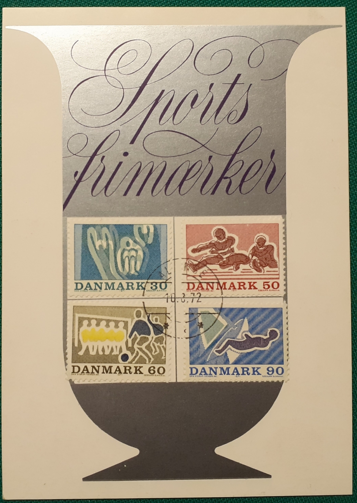 Datiert vom 10.8.1972: Gedenkkarte: Sports Gedenkkarte der dänischen Post mit dem Titel "Sports frimärker"; Satz von 4 Marken mit Sportmotiven; herausgegeben am 14. Oktober 1971; abgestempelt mit schönem Rundstempel am 10.8.1972 in Allinge, Bornholm; sehr guter altersgemäßer Zustand Preis: 2 EURO |