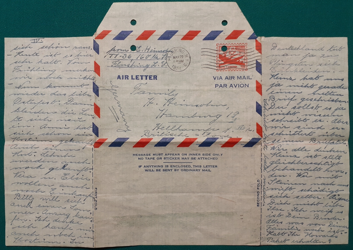 Datiert vom 22.3.1954: Aerogramm "Propellerflugzeug" Aerogramm mit aufgedrucktem "Propellerflugzeug 10 C"; gelaufen von Flushing (New York City) nach Hamburg; eng auf Deutsch beschrieben; oben gelocht; gut lesbar; schöner Stempel in gutem altersgemäßen Zustand Preis: 2 EURO |