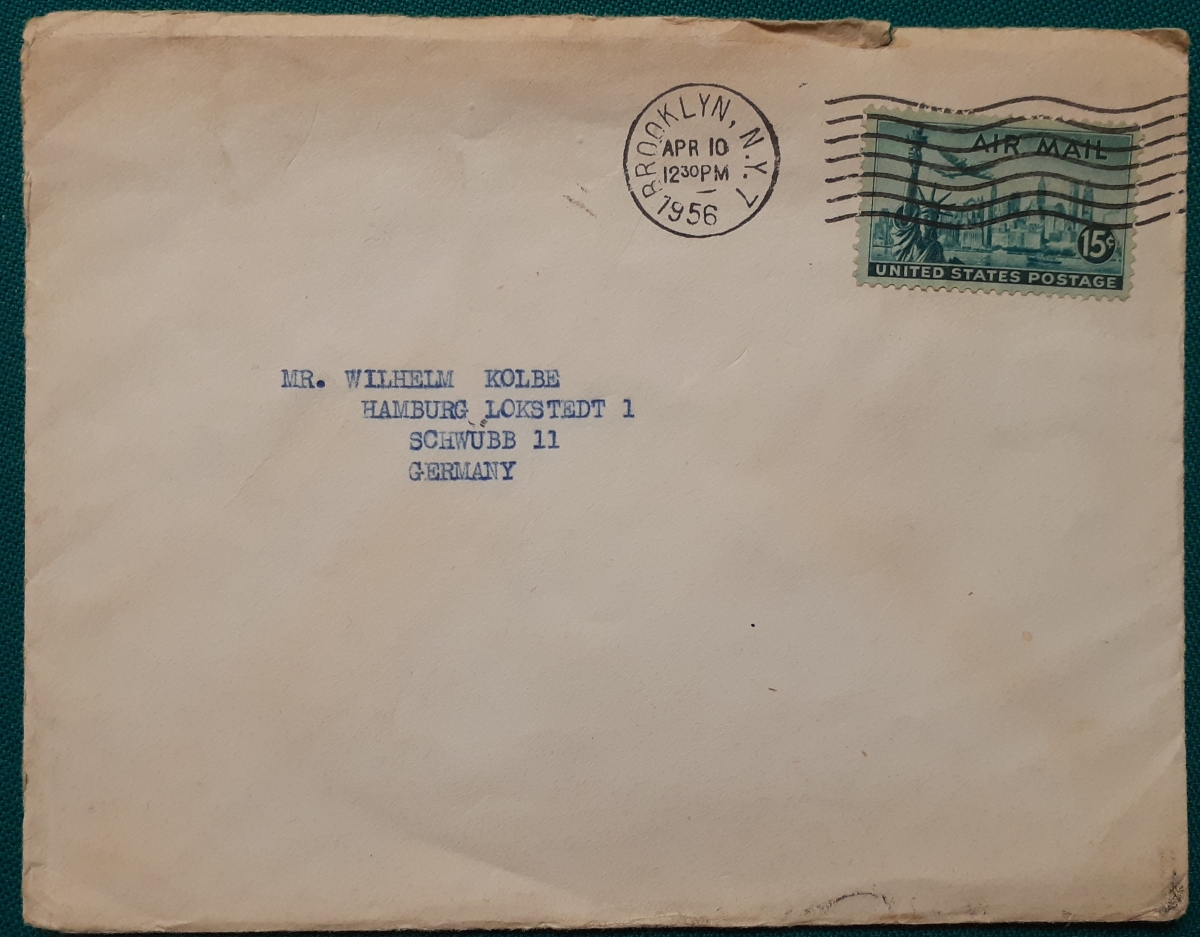 Datiert vom 10.4.1956: Brief von Brooklyn (New York City) nach Hamburg Umschlag frankiert mit der Briefmarke "Flugpostausgabe 15 C - Flugzeug über Wolkenkratzer in New York und Freiheitsstatue"; gelaufen von Brooklyn (New York City) nach Hamburg; Briefmarke herausgegeben am 20.8.1947 ; schöner Stempel in gutem altersgemäßen Zustand Preis: 1 EURO |