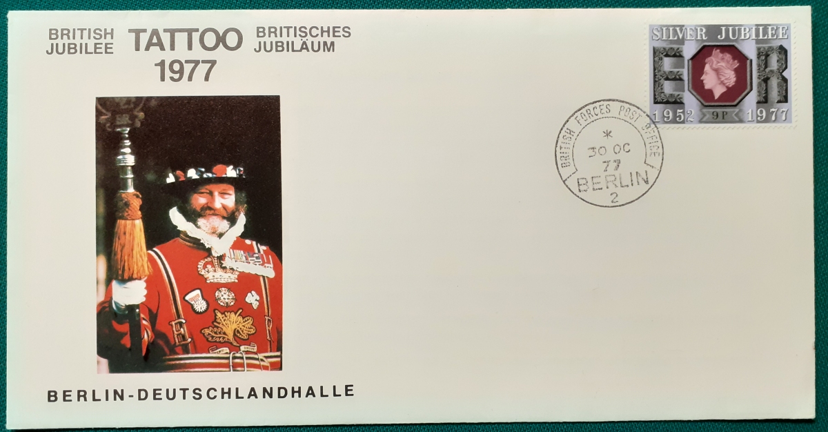 Gedenkbrief zum Umschlag mit schönem Sonderstempel der British Forces in Berlin; frankiert mit einer Marke zum Silbernen Thronjubiläum der Queen; dazu ein Gedenkblatt innenliegend in deutscher und englischer Sprache zu den Darbietungen der Britischen Streitkräfte; sehr guter altersgemäßer Zustand Preis: 3 EURO |