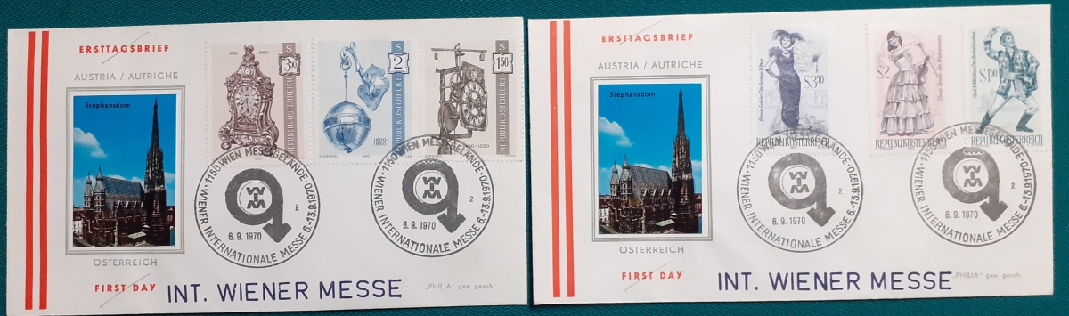 6.9.1970 Wiener Internationale Messe 1970 Umschlag mit aufgeklebten Sätzen "Alte Uhren" sowie "Berühmte Operetten" Marken aus dem Juni und Juli 1970; schöne Sonderstempel der Messe; kein Ersttagsbrief - wie auf dem Umschlag angegeben; montiertes Farbfoto des Stephansdoms; Brief in gutem altersgemäßen Zustand Komplettpreis: 5 EURO |
