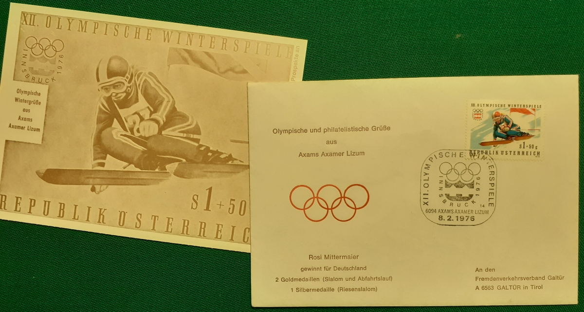 8.2.1976 Olympische Winterspiele 1976 in Innsbruck Umschlag mit aufgeklebter Marke "Slalomläuferin", schöne Sonderstempel zu den Olympischen Spielen; Hrsg. Fremdenverkehrsverband Galtür: Feedbackbrief innenliegend für Deutsche Touristen anlässlich der NORDPOSTA 1976 in Hamburg: Werbung mit Rosi Mittermaier, die 2 Gold- und eine Silbermedaille gewonnen hat; Brief in gutem altersgemäßen Zustand Preis: 2 EURO |