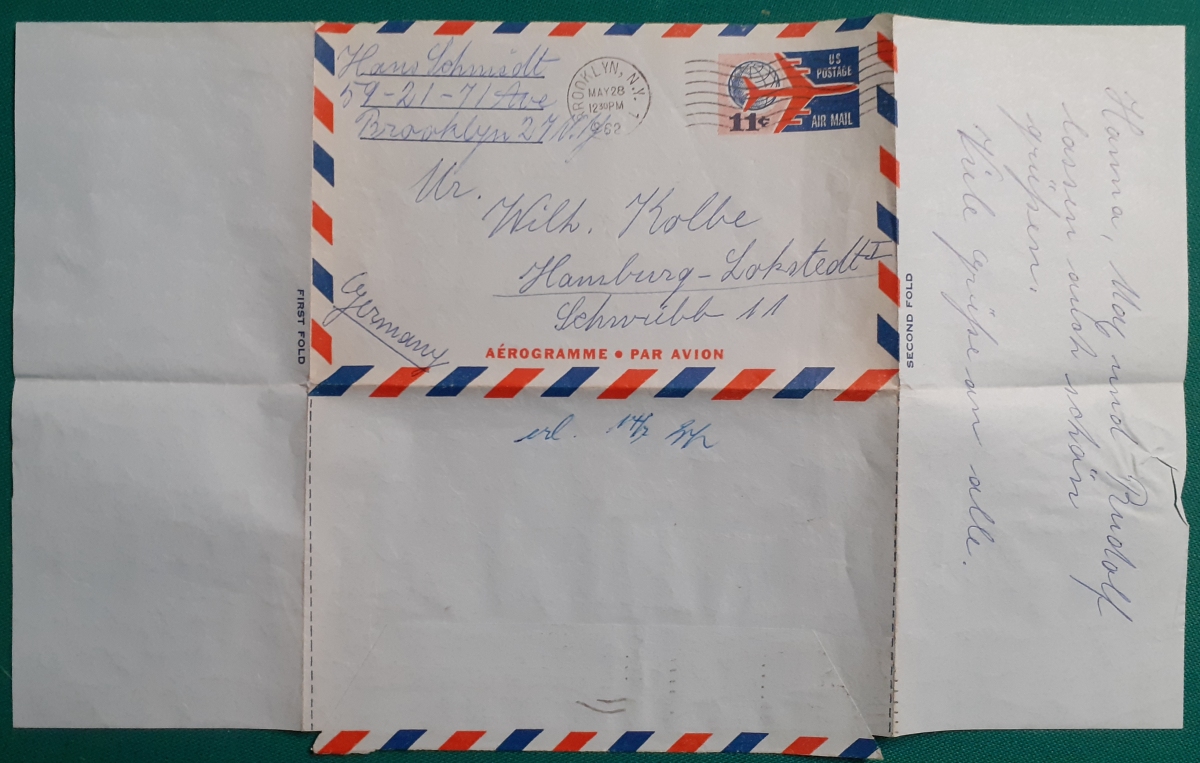 Datiert vom 28.5.1962: Aerogramm "Düsenflugzeug 2" Aerogramm mit aufgedrucktem "Düsenflugzeug 11 C"; gelaufen von Brooklyn (New York City) nach Hamburg; sauber auf Deutsch beschrieben; gut lesbar; schöner Stempel in gutem altersgemäßen Zustand Preis: 2 EURO |