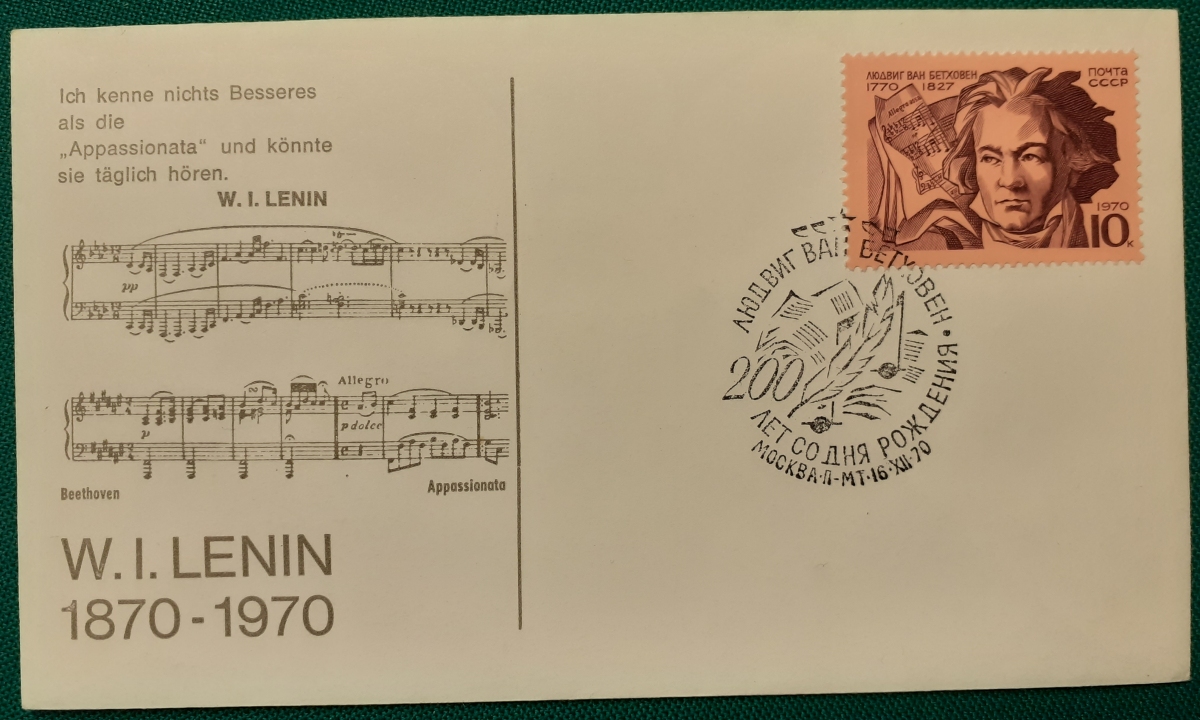 Beethoven 1770-1827 Umschlag mit aufgeklebter Marke "Beethoven 1770-1827; 10 Kop." und Sonderstempel in gutem altersgemäßen Zustand Preis: 3 EURO |