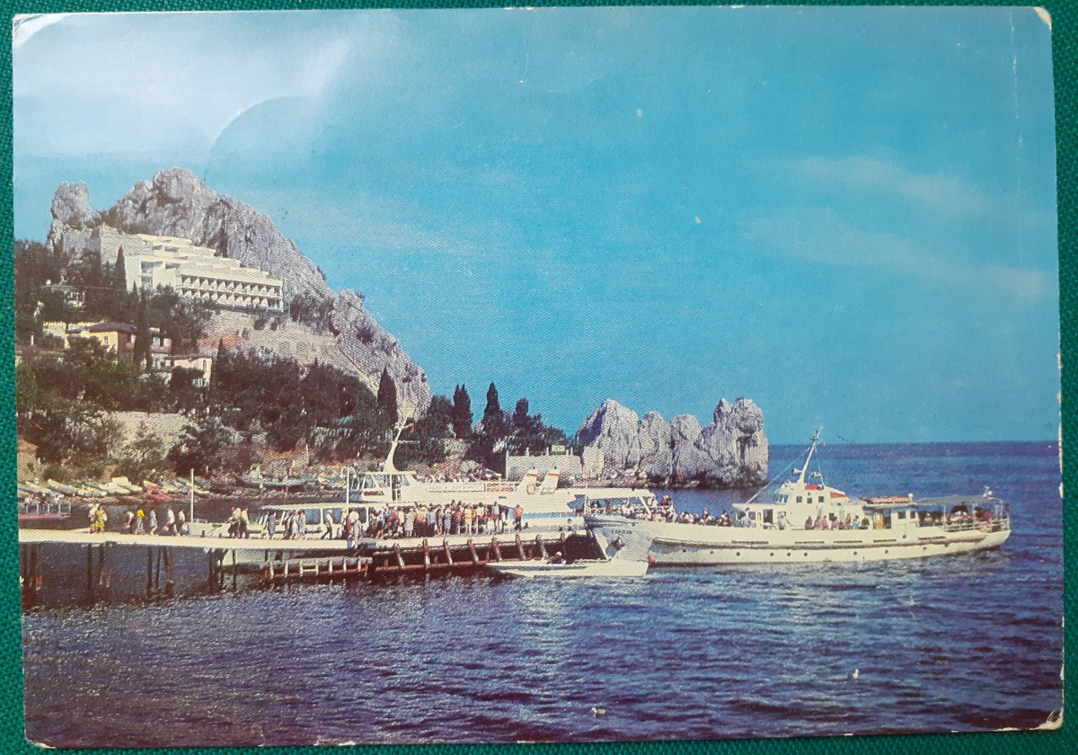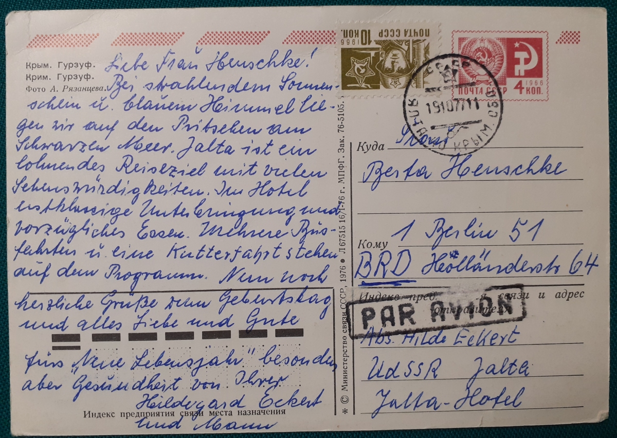 Karte von der Vorgedruckte Ansichtskarte vom Schwarzen Meer (Krim); Luftpost gelaufen von der Krim nach Berlin; mit einer zusätzlichen Marke frankiert; schöner Rundstempel; Karte an den Kanten bestoßen; Karte in recht gutem altersgemäßen Zustand Preis: 1 EURO |