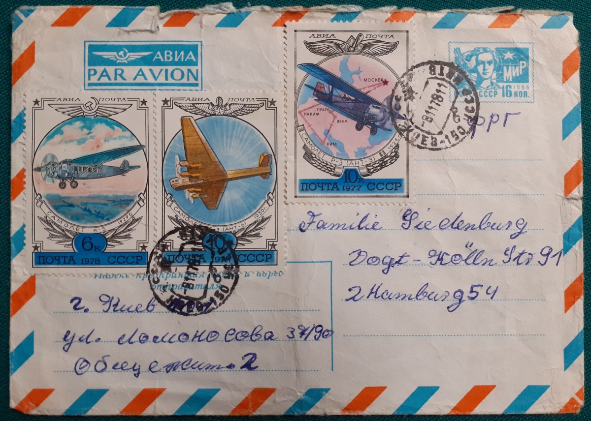 Luftpostumschlag Vorgedruckter Luftpostumschlag, zusätzlich frankiert mit drei schönen Marken; Luftpost gelaufen von Moskau nach Berlin; schöne Rundstempel; Umschlag an den Kanten bestoßen; Umschlag in recht gutem altersgemäßen Zustand Preis: 1 EURO |