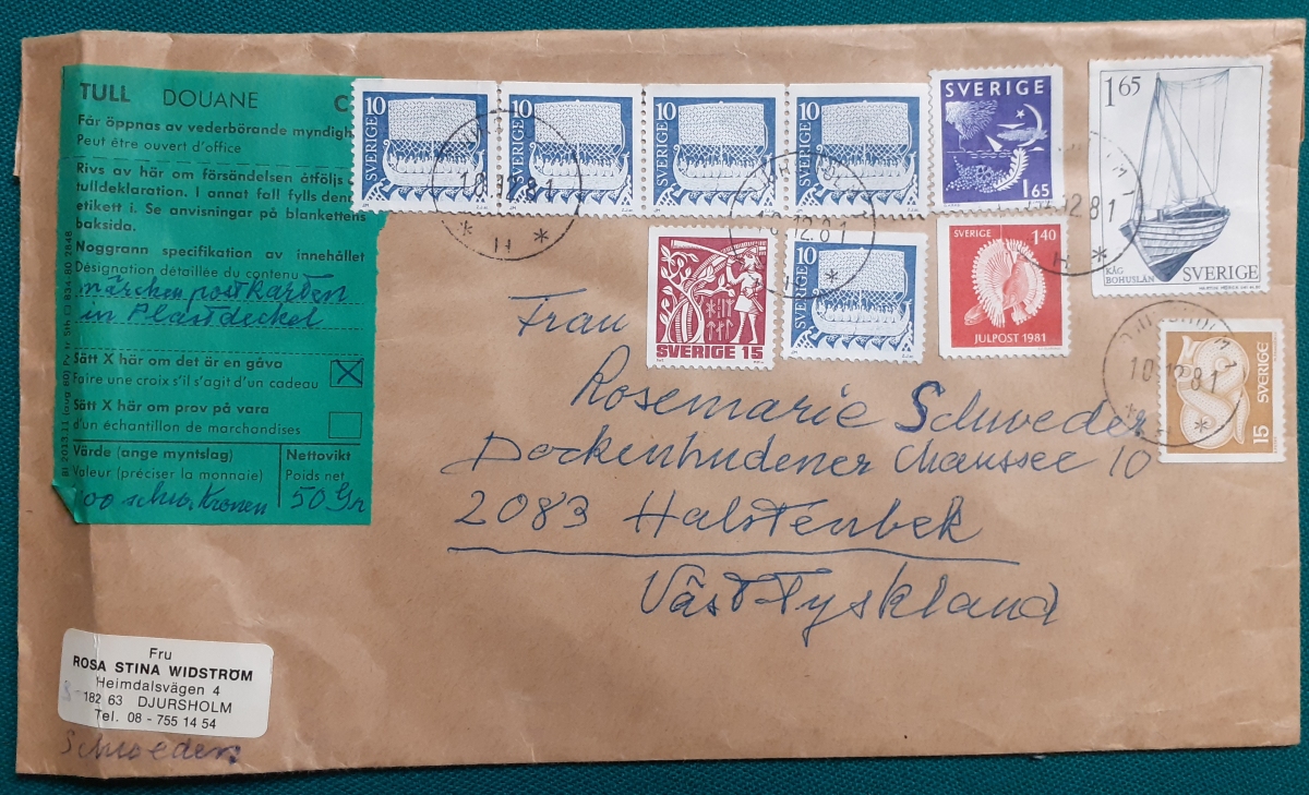Umschlag mit 10 Marken und schönen Rundstempeln sowie einem Zoll-Aufkleber; gelaufen nach Halstenbek; recht guter altersgemäßer Zustand Preis: 1 EURO |