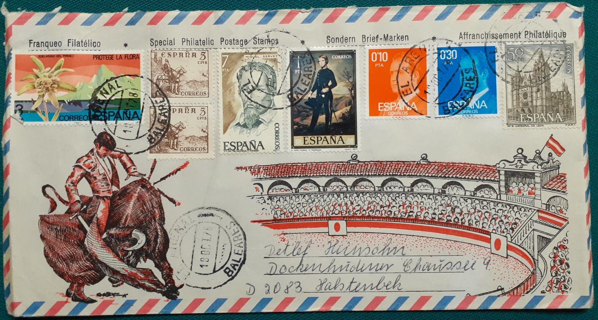 Luftpostumschlag mit 8 Marken und schönen Rundstempeln; gelaufen von El Arenal nach Halstenbek (bei Hamburg); Format 21 x 11,5 cm; guter altersgemäßer Zustand Preis: 1 EURO |