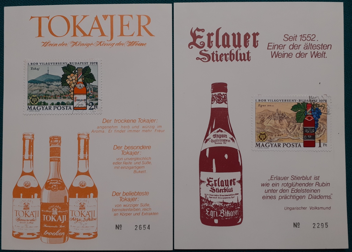 Nummerierte Gedenkkarten (Format 15,5 x 11 cm) in deutscher Sprache zu ungarischen Weinen (Nummern 2654 und 2295) mit jeweils einer regulären gestempelten Briefmarke zum Weinbau in Ungarn von 1972; sehr guter altersgemäßer Zustand Komplettpreis: 2 EURO |