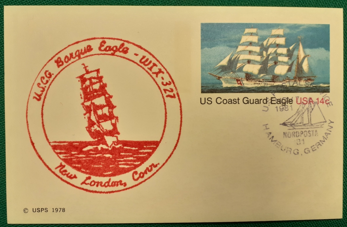 anlässlich der Briefmarkenausstellung Postkarte der USA mit aufgedruckter Marke "US Coast Guard Eagle, USA 14 C" von 1978 und zusätzlich dem Sonderstempel "USCG. Bargue Eagle - WIX-327, New London, Conn."; Karte in gutem altersgemäßen Zustand Preis: 2 EURO |