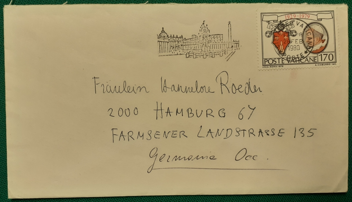 Umschlag aus dem Vatikan mit Sonderstempel und sehr gutem Rundstempel; Marke Vatikan 1929 bis 1979; gelaufen von Rom nach Hamburg; guter altersgemäßer Zustand Preis: 1 EURO |
