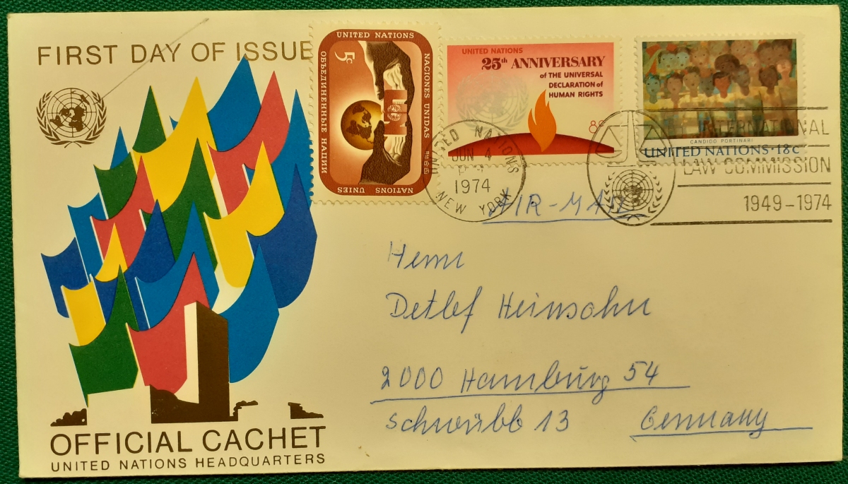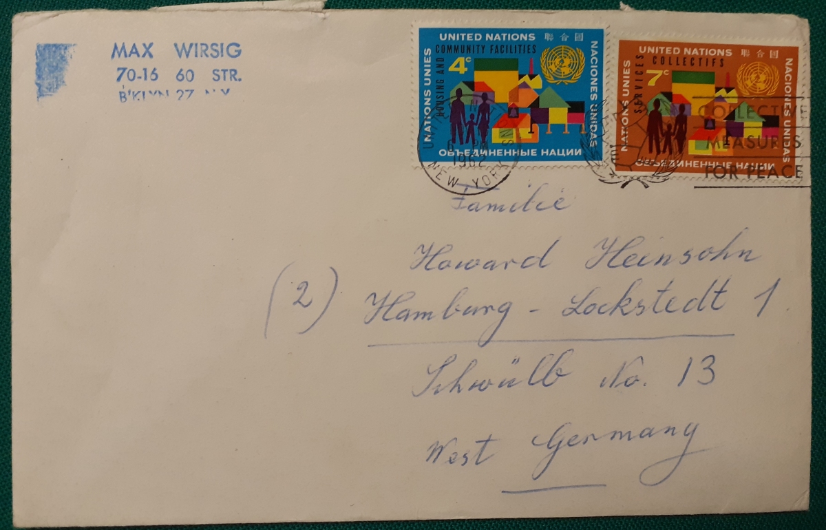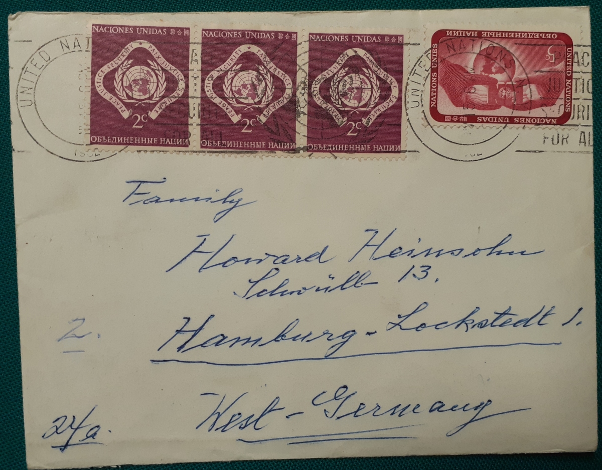 Datiert vom 15.6.1962: Umschlag mit Stempel und Sonderstempel der Vereinten Nationen Umschlag mit Sonderstempel und gutem Rundstempel; mit 4 Briefmarken; gelaufen von New York City nach Hamburg; guter altersgemäßer Zustand Preis: 2 EURO |