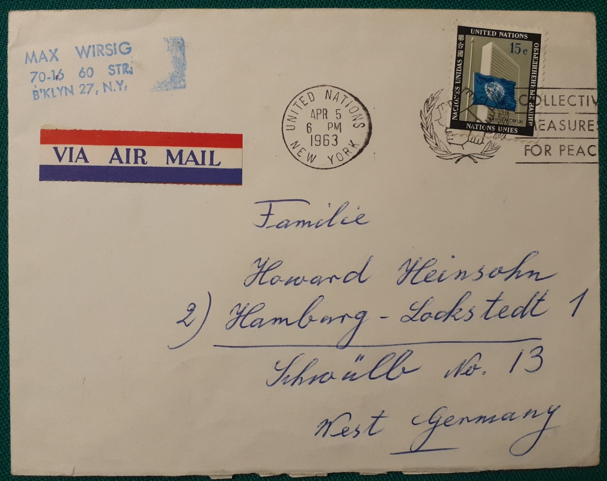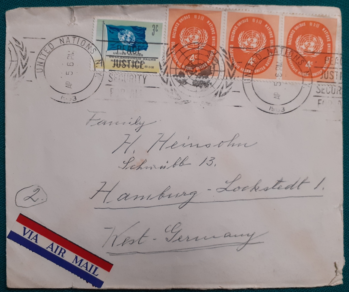 Datiert vom 5.4.1963: Umschlag mit Stempel und Sonderstempel der Vereinten Nationen Umschlag mit Sonderstempel und gutem Rundstempel; gelaufen per Luftpost von New York City nach Hamburg; guter altersgemäßer Zustand Preis: 2 EURO |