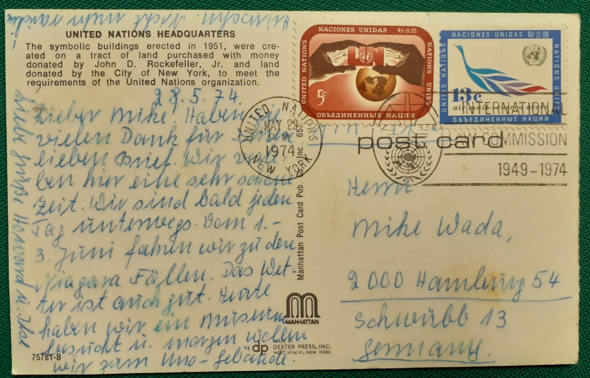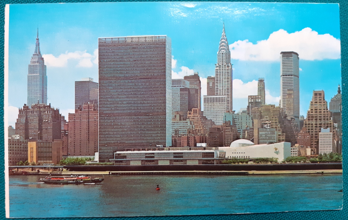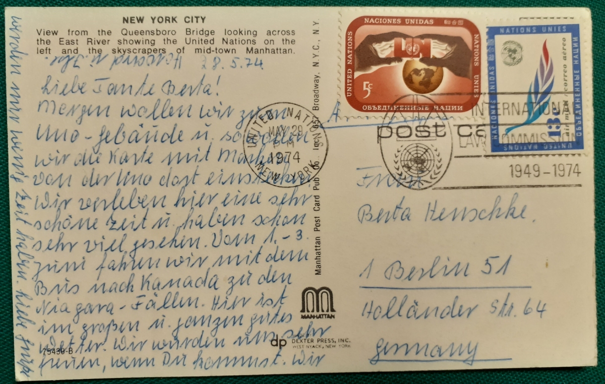Datiert vom 29.5.1974: Ansichtskarte mit Stempel und Sonderstempel der Vereinten Nationen Ansichtskarte von Manhattan mit Sonderstempeln und sehr gutem Rundstempel; gelaufen von New York City nach Berlin; guter altersgemäßer Zustand Preis: 3 EURO |