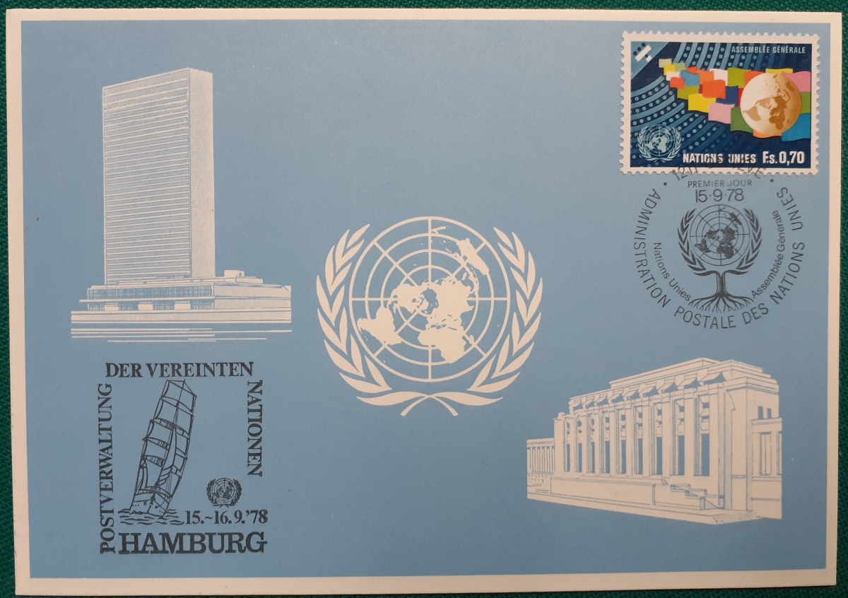 Vereinten Nationen Offizieller Sonderstempel der Postverwaltung der Vereinten Nationen in Hamburg; und sehr gutem Rundstempel; dazu der Stempel der Briefmarkenausstellung NORDPOSTA; sehr guter altersgemäßer Zustand Preis: 3 EURO |