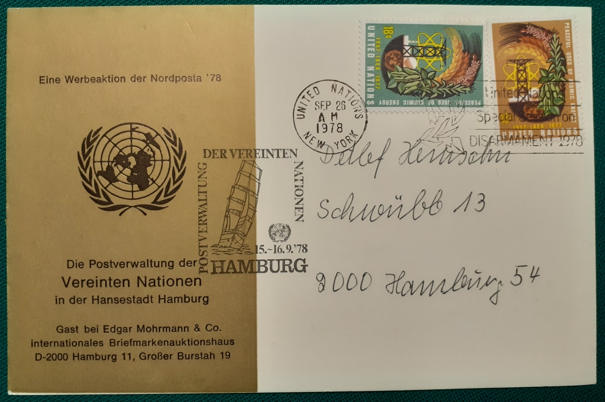 Offizieller Sonderstempel der Postverwaltung der Vereinten Nationen in Hamburg; und sehr gutem Rundstempel; dazu der Stempel der Briefmarkenausstellung NORDPOSTA; sehr guter altersgemäßer Zustand Preis: 2 EURO |