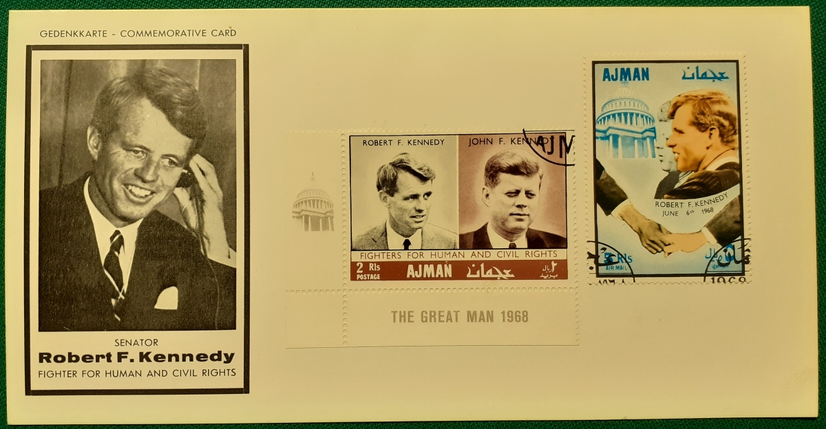 Datiert von 1968: Gedenkkarte zur Ermordung von Robert F. Kennedy Gedenkkarte zum Tod von Robert F. Kennedy - Fighter for Human and Civil Rights; mit zwei Briefmarken der beiden Brüder John und Robert Kennedy; Format: 20,5 x 11 cm; guter altersgemäßer Zustand Preis: 3 EURO |