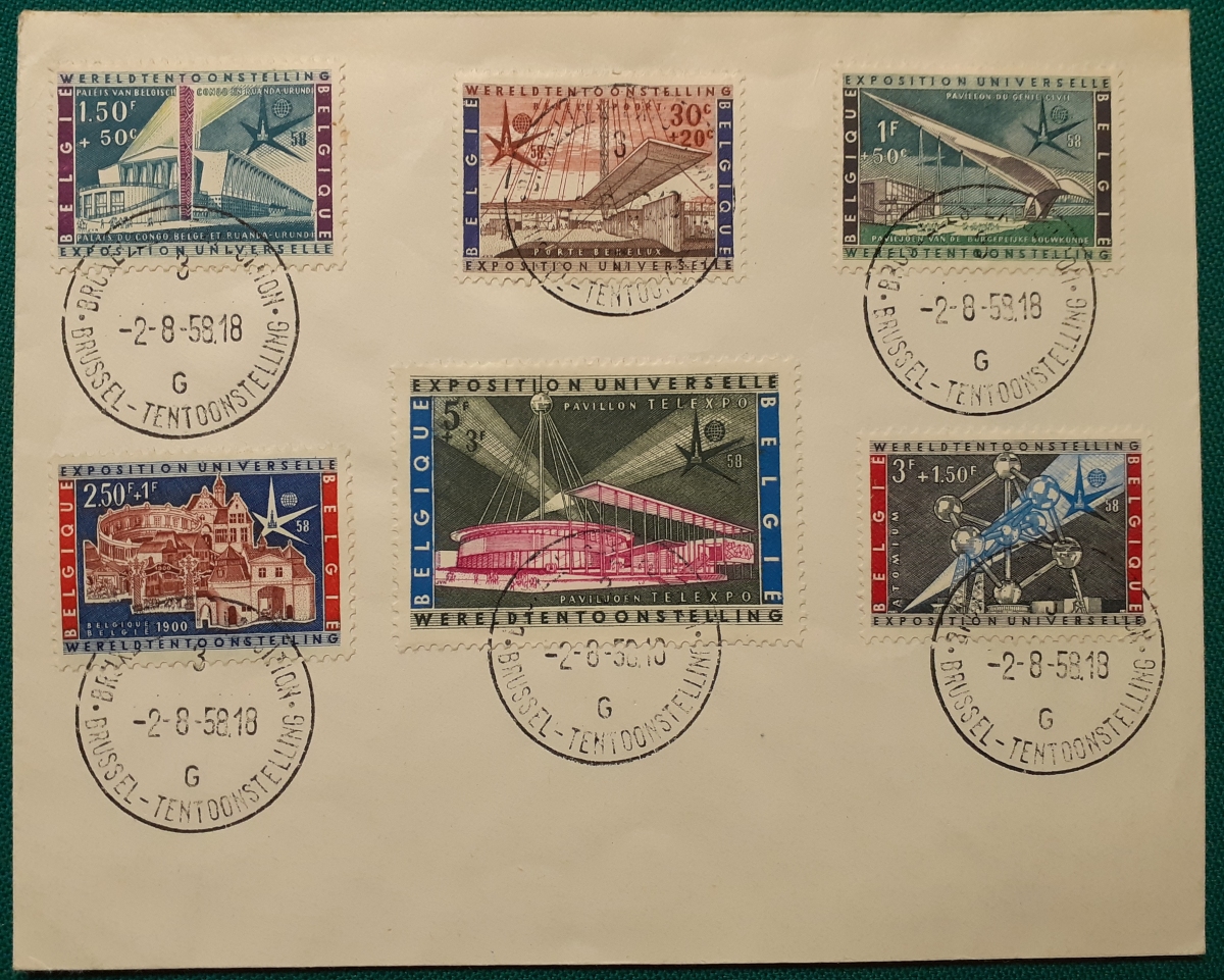 Datiert vom 2.8.1958: Weltausstellung in Brüssel 1958 Umschlag mit allen 6 Marken des Satzes anläßlich der Weltausstellung; jeweils mit den Sonderstempeln zur Ausstellung abgestempelt; Umschlag und Marken in gutem altersgemäßen Zustand Preis: 3 EURO |