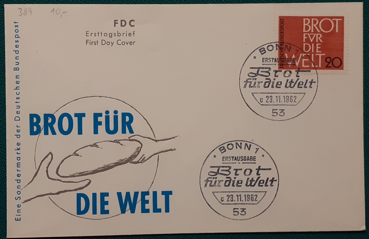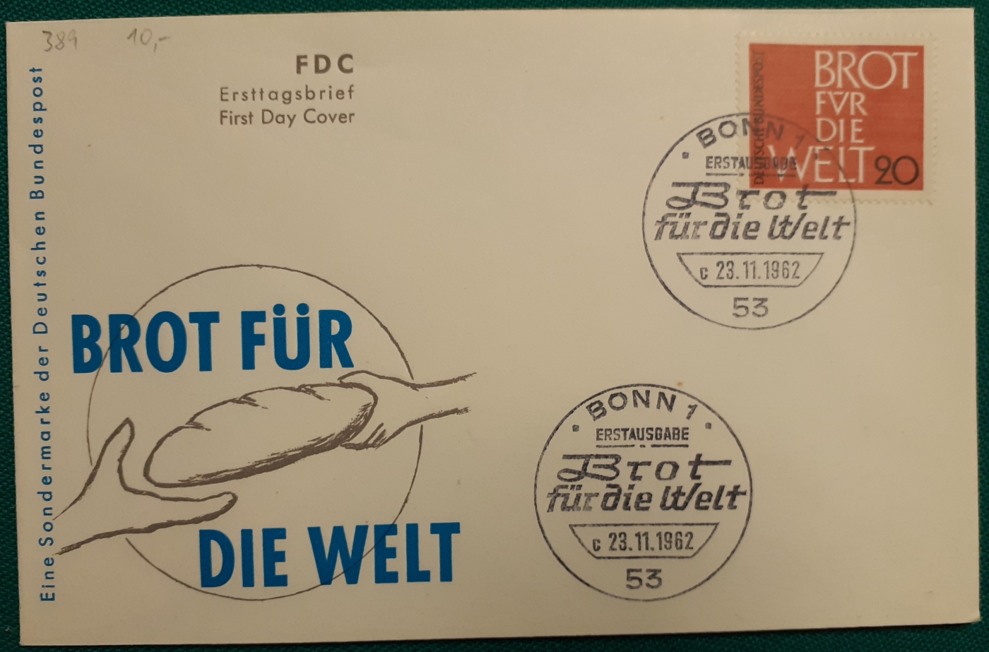 Brot für die Welt: Michel-Nr. 389 Offizieller Umschlag mit Ersttagsstempeln; sehr guter altersgemäßer Zustand Preis: 7 EURO |