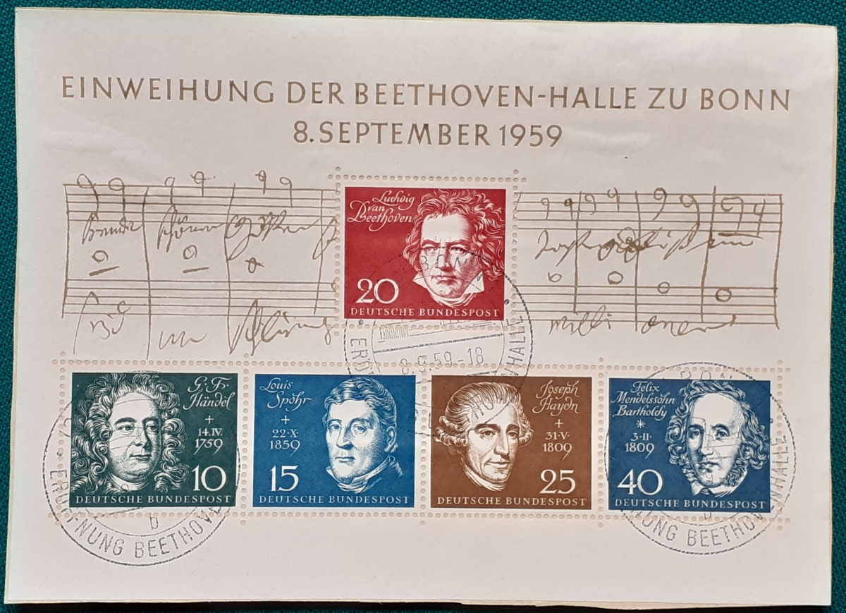 Einweihung der Beethovenhalle zu Bonn: Michel-Block-Nr. 2 Mit drei Ersttagsstempeln; der Block ist auf eine Pappunterlage geklebt; guter altersgemäßer Zustand Preis: 89 EURO |
