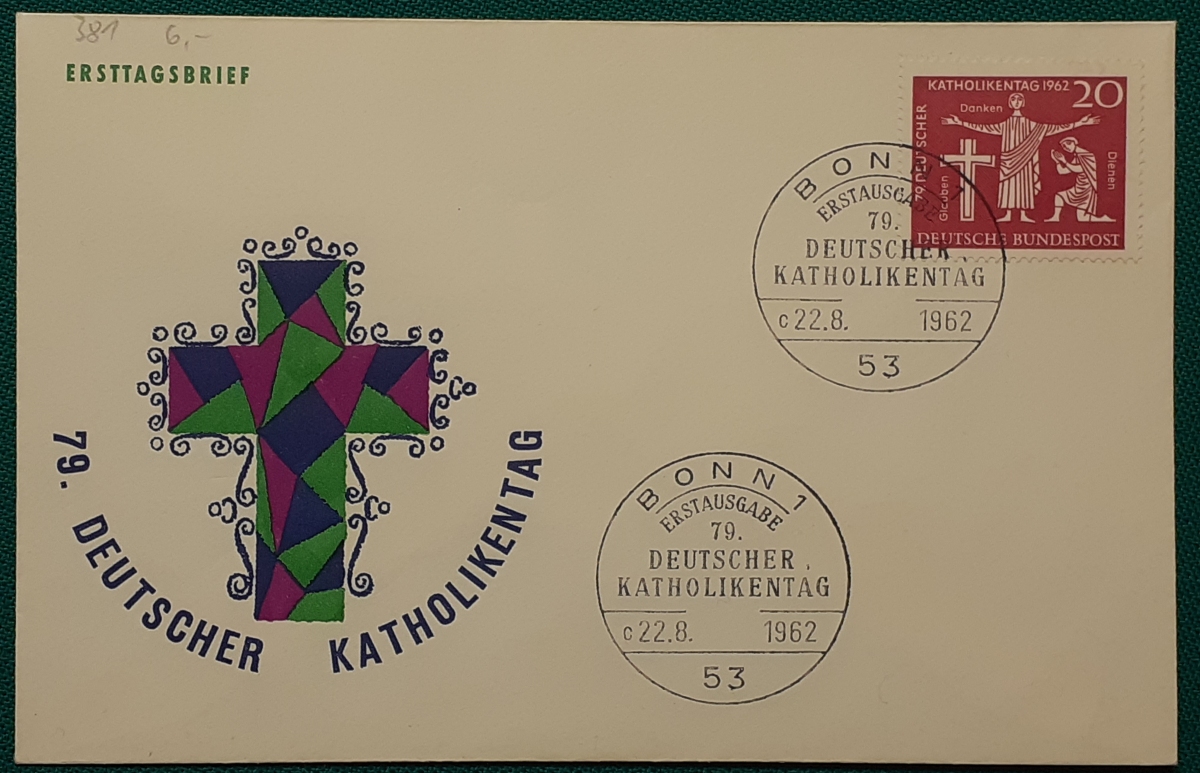 Deutscher Katholikentag1962: Michel-Nr. 381 Offizieller Umschlag mit Ersttagsstempeln; sehr guter altersgemäßer Zustand Preis: 5 EURO |