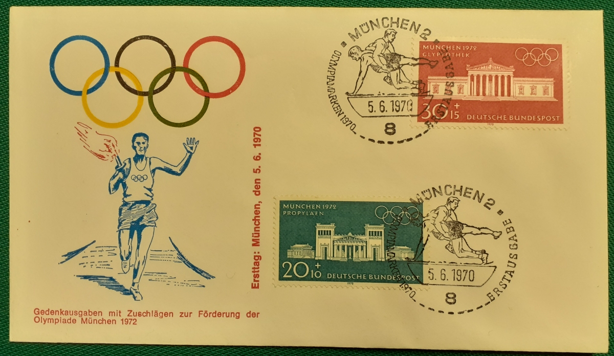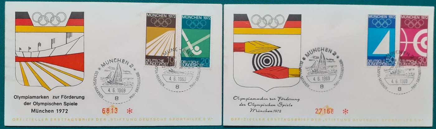Olympiamarken zur Förderung der Michel-Nr. 587 -590 Offizielle Umschläge mit den Ersttagsstempeln; sehr guter altersgemäßer Zustand Komplettpreis beider Umschläge: 5 EURO |