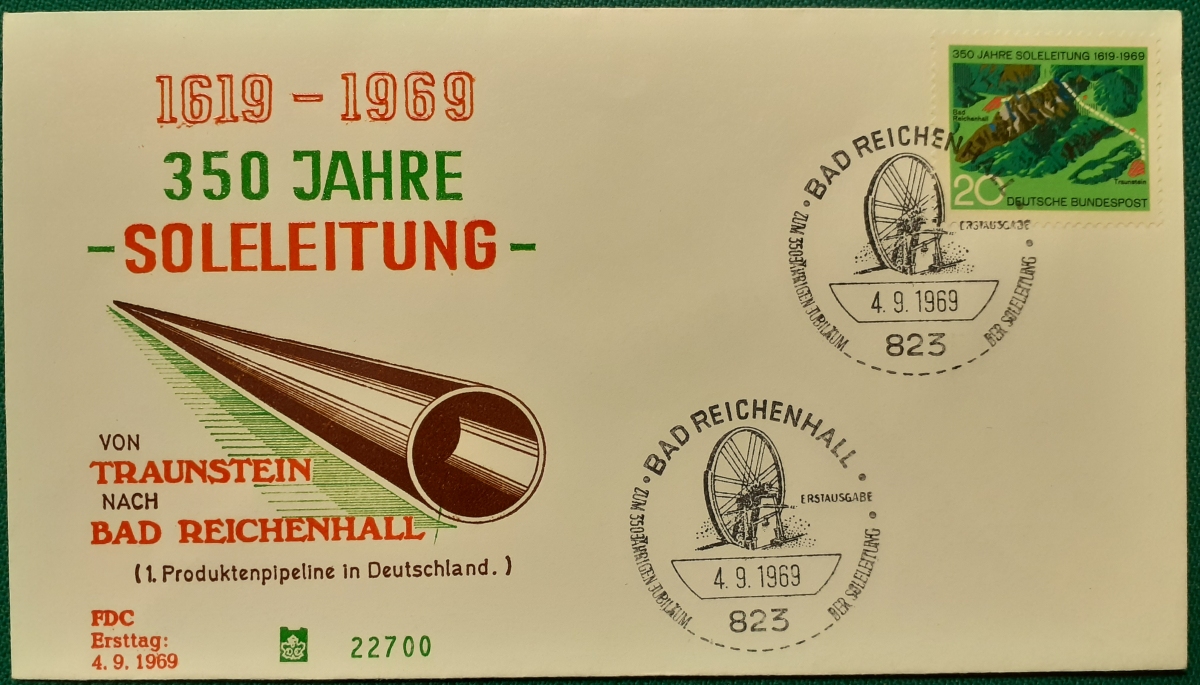 350 Jahre Soleleitung Michel-Nr. 602 Offizieller Umschlag mit Ersttagsstempel; sehr guter altersgemäßer Zustand Preis: 3 EURO |