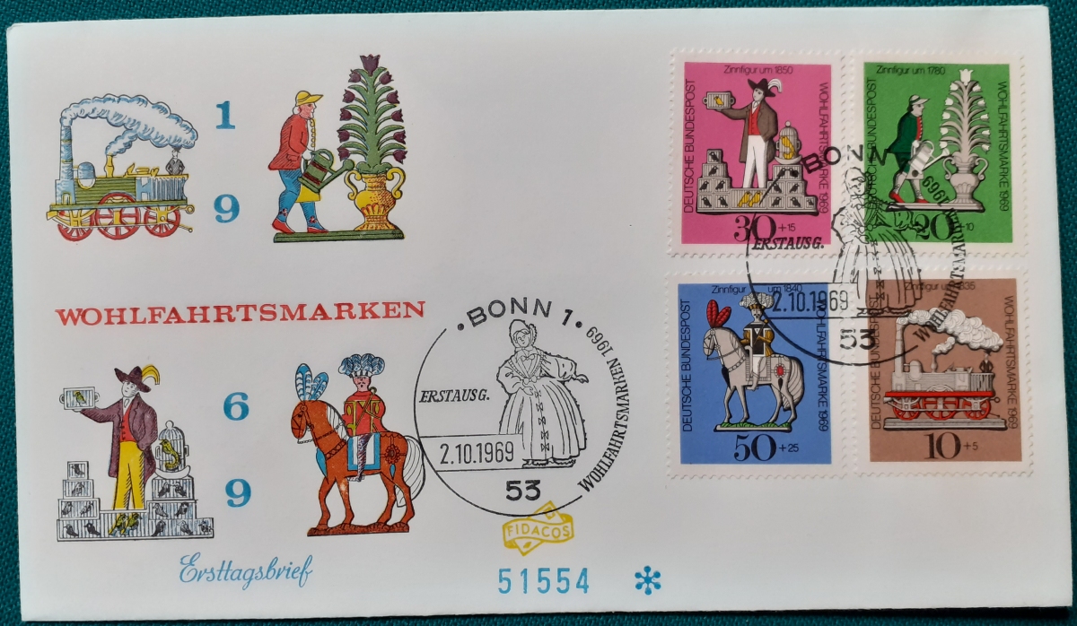 Wohlfahrtsmarken Zinnfiguren Michel-Nr. 604 bis 607 Offizieller Umschlag mit Ersttagsstempel; sehr guter altersgemäßer Zustand Preis: 4 EURO |