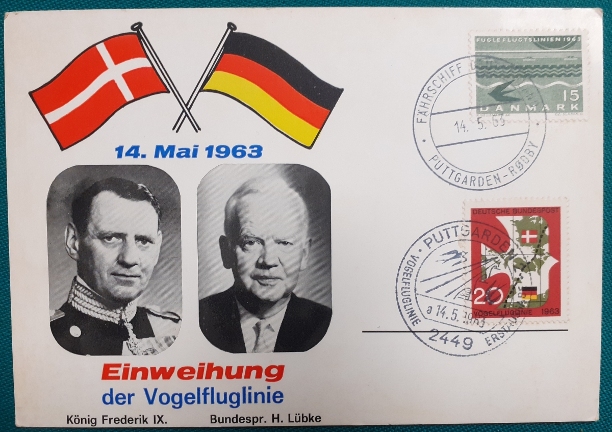 Einweihung der Vogelfluglinie Michel-Nr. 399 Karte mit Ersttagsstempel und Sonderstempel vom Fährschiff "Deutschland" Puttgarden-Rødby; dazu die dänische Sondermarke zu diesem Ereignis; sehr guter altersgemäßer Zustand Preis: 7 EURO |
