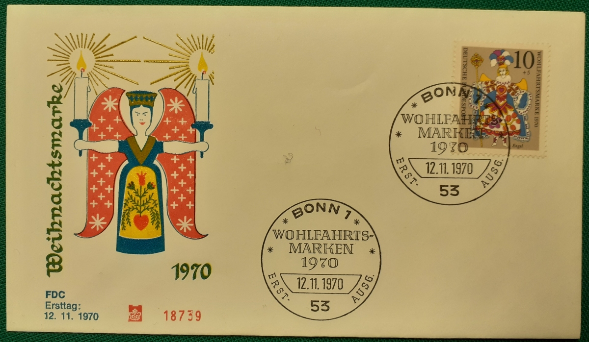 Weihnachtsmarke 1970 Michel-Nr. 655 Offizieller Umschlag mit Ersttagsstempel; sehr guter altersgemäßer Zustand Preis: 2 EURO |