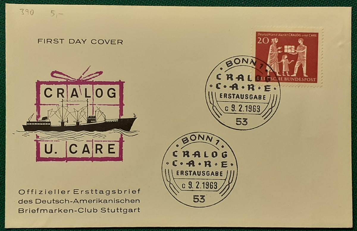 Deutschland dankt CRALOG und CARE: Michel-Nr. 390 Offizieller Umschlag mit Ersttagsstempel; sehr guter altersgemäßer Zustand Preis: 4 EURO |