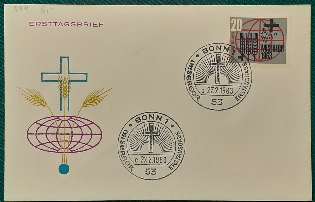 Misereor 1963 Michel-Nr. 391 Offizieller Umschlag mit Ersttagsstempel; sehr guter altersgemäßer Zustand Preis: 4 EURO |
