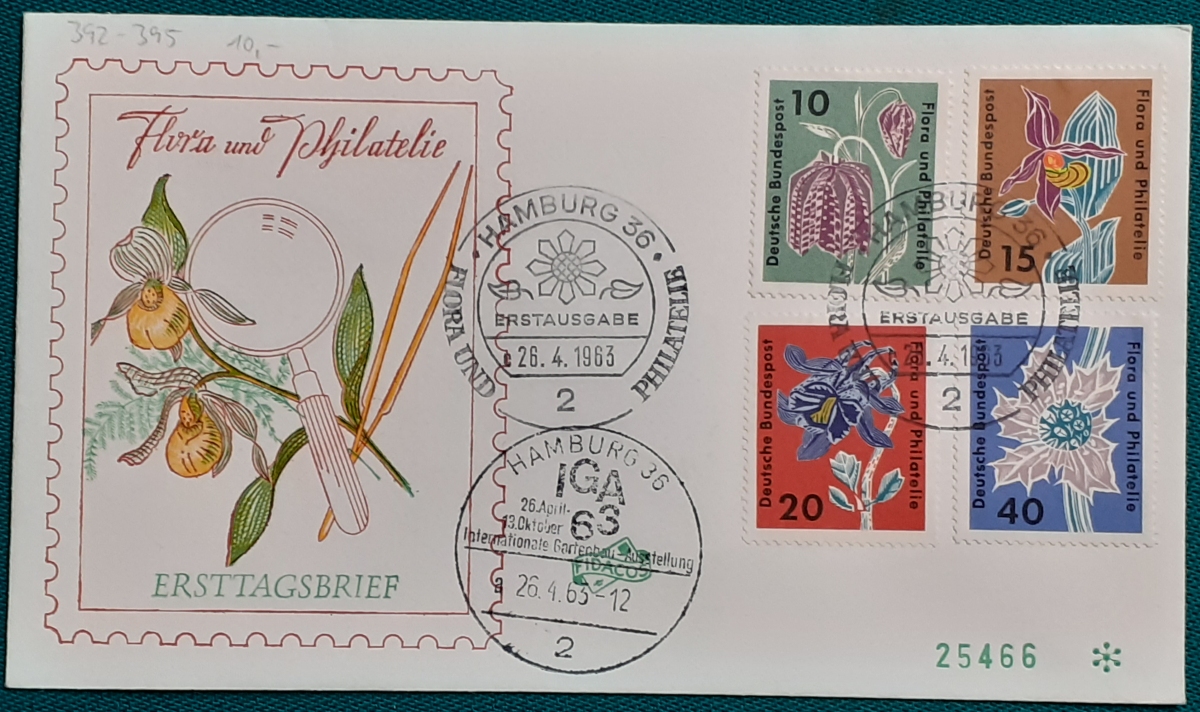 Flora und Philatelie Michel-Nr. 392 - 395 Offizieller Umschlag mit Ersttagsstempel und Sonderstempel der IGA Hamburg; sehr guter altersgemäßer Zustand Preis: 6EURO |