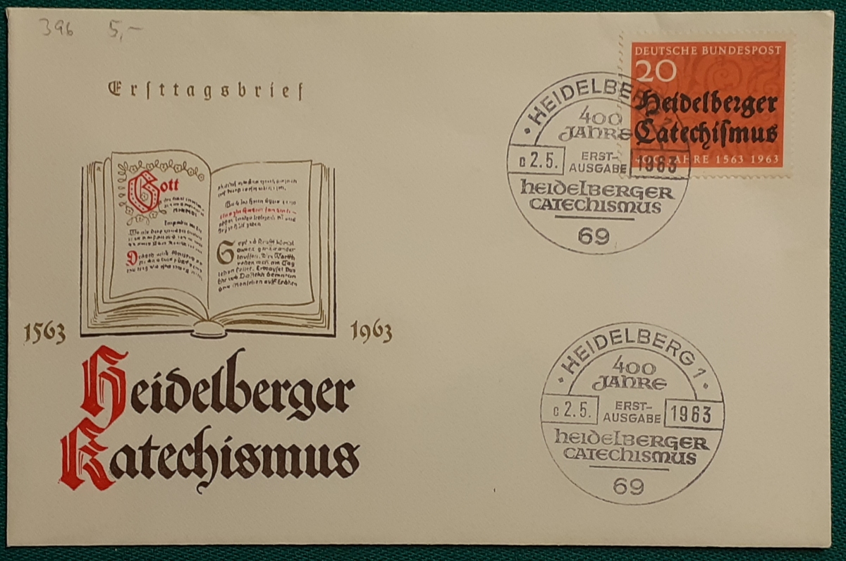 400 Jahre Heidelberger Katechismus Michel-Nr. 396 Offizieller Umschlag mit Ersttagsstempel; adressiert an eine Hamburger Adresse; sehr guter altersgemäßer Zustand Preis: 2 EURO |