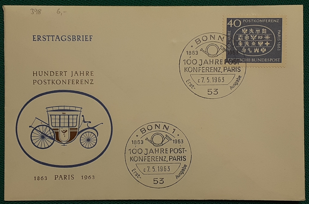 100 Jahre Postkonferenz Paris Michel-Nr. 398 Offizieller Umschlag mit Ersttagsstempel; sehr guter altersgemäßer Zustand Preis: 5 EURO |
