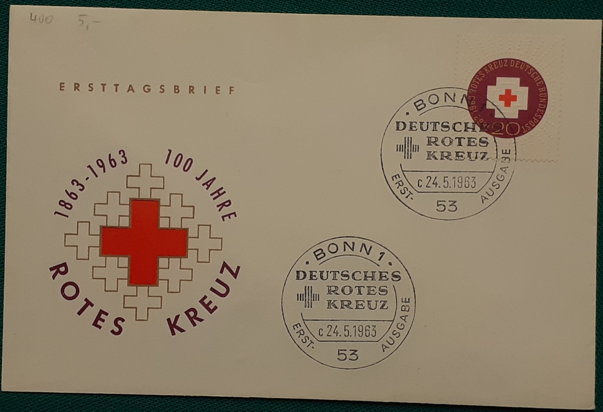 100 Jahre Rotes Kreuz Michel-Nr. 400 Offizieller Umschlag mit Ersttagsstempel; sehr guter altersgemäßer Zustand Preis: 4 EURO |