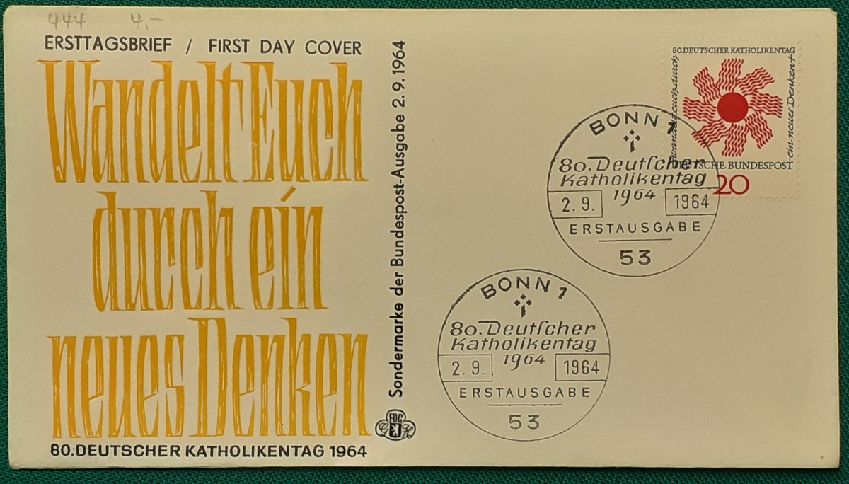 80. Deutscher Katholikentag 1964 Michel-Nr. 444 Offizieller Umschlag mit Ersttagsstempel; sehr guter altersgemäßer Zustand Preis: 3 EURO |
