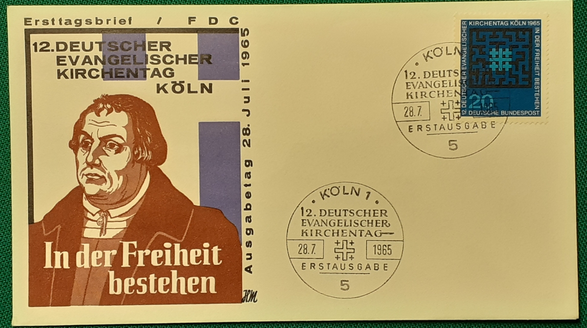 12. Evangelischer Kirchentag 1965 in Köln Michel-Nr. 480 Offizieller Umschlag mit Ersttagsstempel; sehr guter altersgemäßer Zustand Preis: 3 EURO |