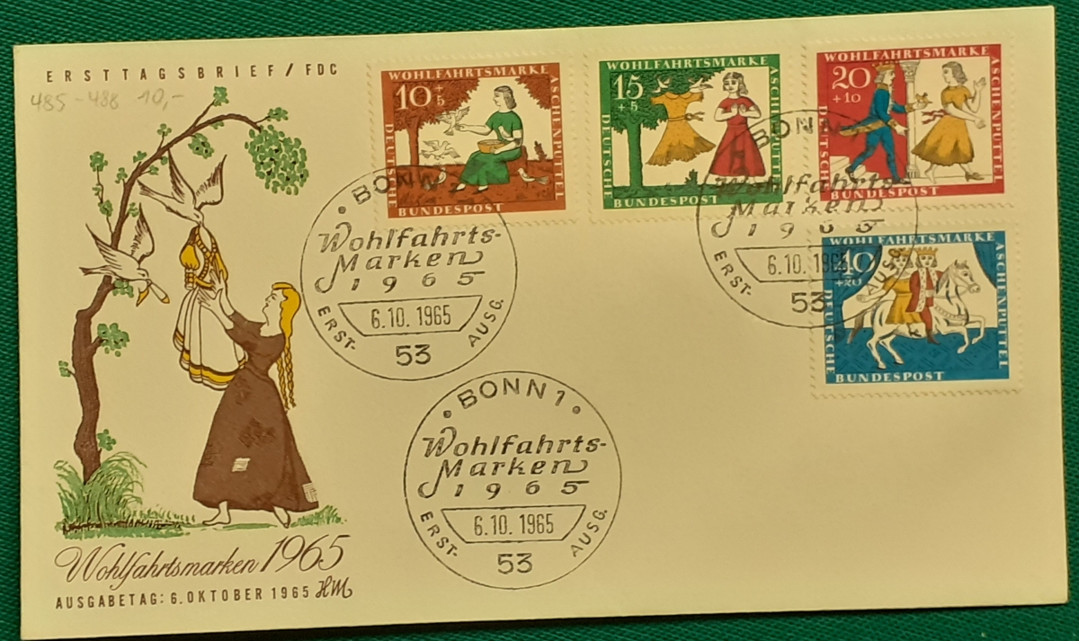 Wohlfahrtsmarken 1965 Michel-Nr. 485 - 488 Offizieller Umschlag mit Ersttagsstempel; sehr guter altersgemäßer Zustand Preis: 3 EURO |