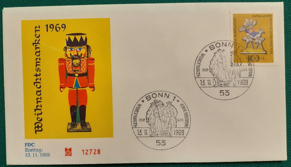 Weihnachten 1969 Michel-Nr. 610 Offizieller Umschlag mit Ersttagsstempel; sehr guter altersgemäßer Zustand Preis: 3 EURO |