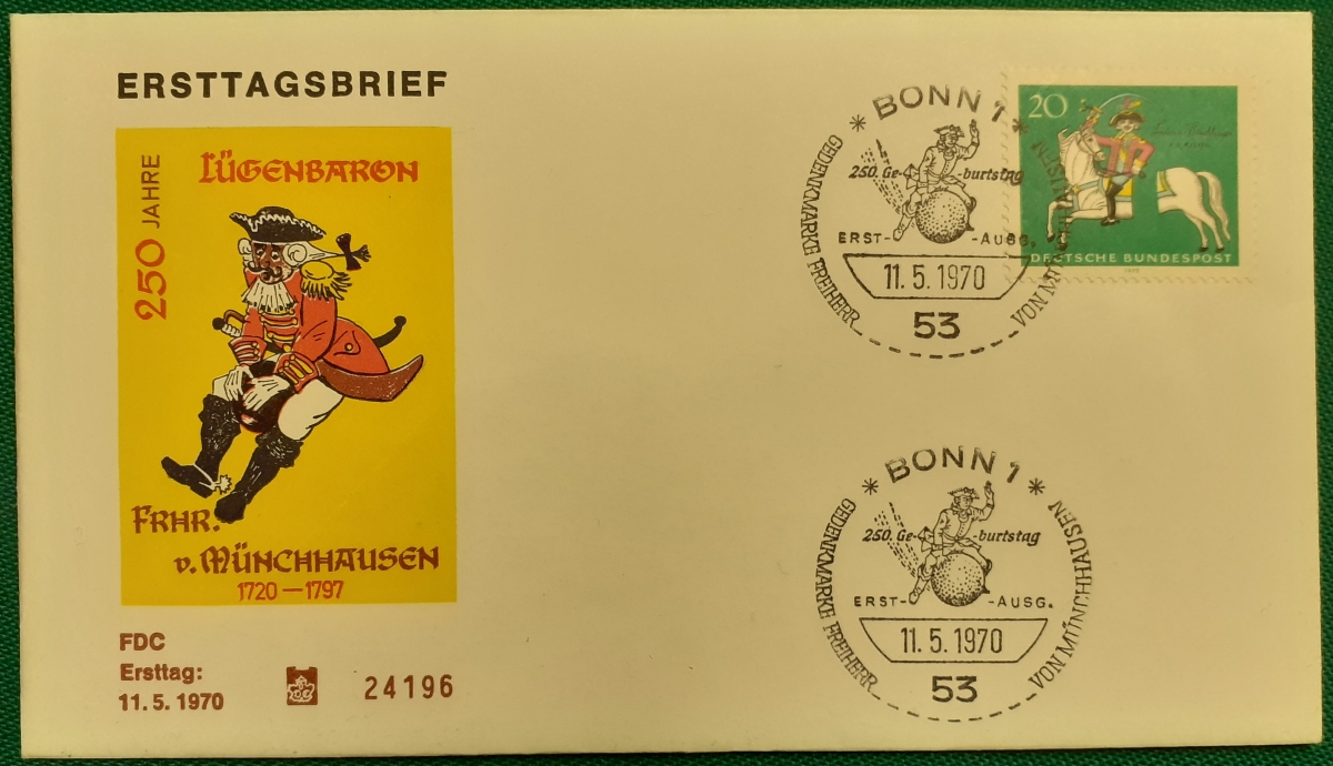 250. Geburtstag Münchhausen Michel-Nr. 623 Offizieller Umschlag mit Ersttagsstempel; sehr guter altersgemäßer Zustand Preis: 3 EURO |