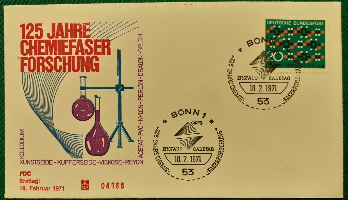 125 Jahre Chemiefaserforschung Michel-Nr. 664 Offizieller Umschlag mit Ersttagsstempel; sehr guter altersgemäßer Zustand Preis: 2 EURO |
