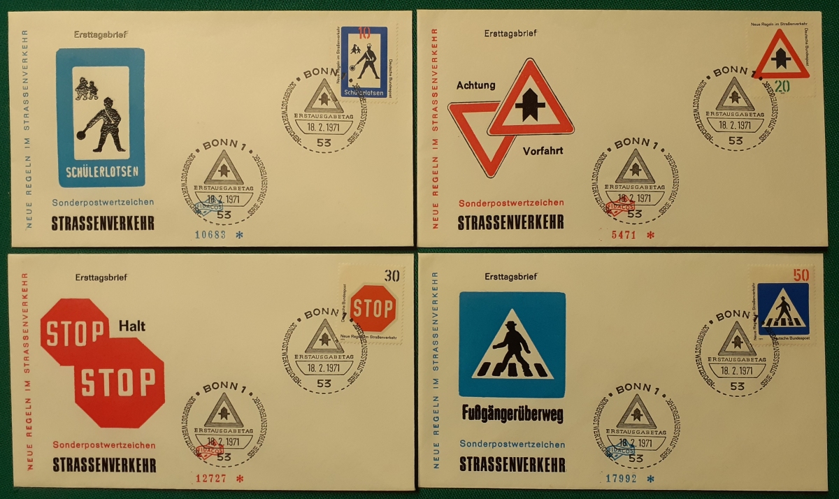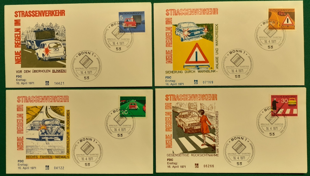 Strassenverkehr - Serie I Michel-Nr. 665 bis 668 Jeweils offizieller Umschlag mit Ersttagsstempeln; jeweils sehr guter altersgemäßer Zustand Komplettpreis: 6 EURO |