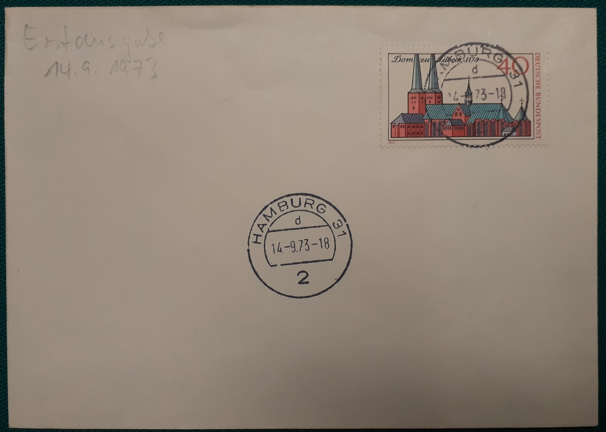 800 Jahre Lübecker Dom Michel-Nr. 779 Umschlag mit Stempel vom Erstausgabetag; schöne Rundstempel aus Hamburg; sehr guter altersgemäßer Zustand Preis: 1 EURO |