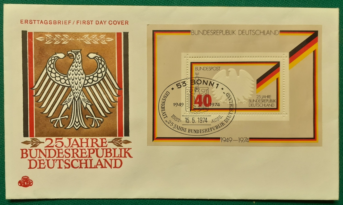 25 Jahre Bundesrepublik Deutschland 1974 Michel-Nr. Block 10 Offizieller Umschlag mit Ersttagsstempel; sehr guter altersgemäßer Zustand Preis: 4 EURO |